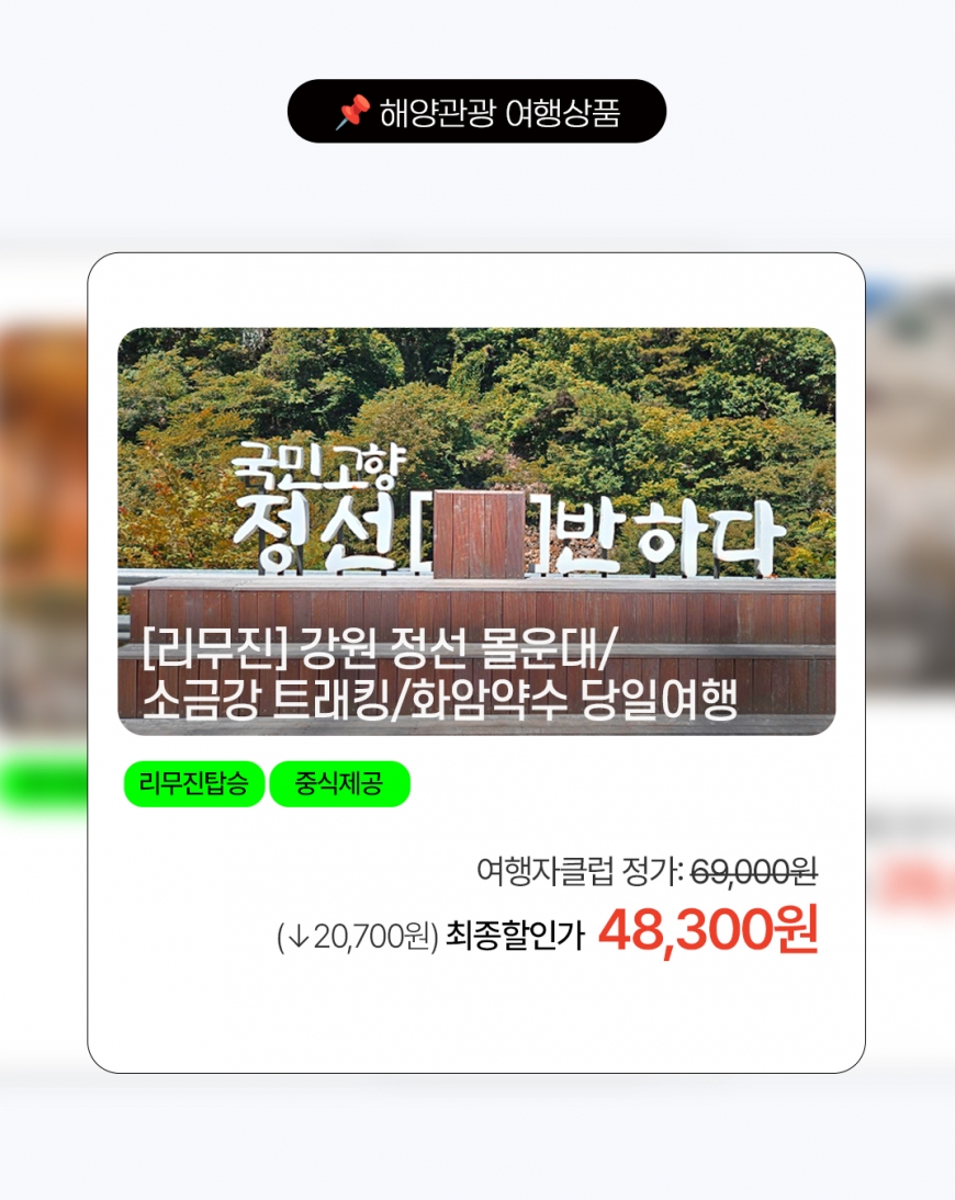 정선 도착 및 정선 몰운대관람 후 소금강 트래킹 - 정선몰운대-마을-소금강 트레킹-화암약수 - 거리: 6-7㎞, 소요시간: 3시간30분 * 트래킹난이도 : 하(상) 정선 몰운대