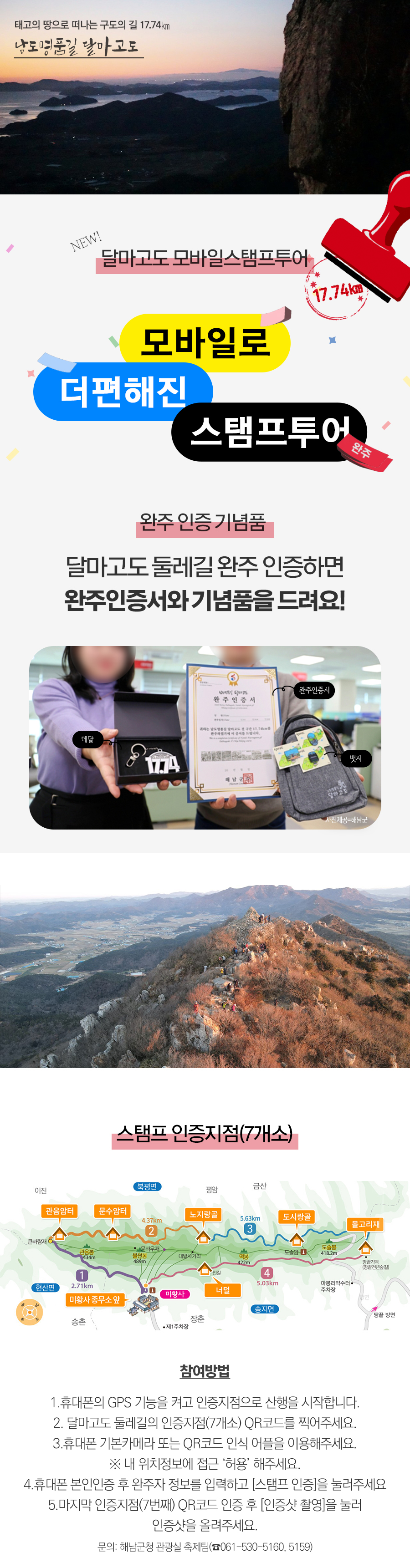 달마산 달마고도 일출 트래킹과 미황사여행 - 총 17.74㎞, 6시간30분 (8시간30분 여유있게 시간드립니다.) - 1코스(2.71㎞) 미황사-큰바람재 - 2코스(4.37㎞) 큰바람재-노지랑골 - 3코스(5.63㎞) 노지랑골-몰고리재 - 4코스(5.03㎞) 몰고리재-미황사 * 아침은 간식을 준비해주십시요. * 점심은 트래킹 후 식당에서 제공해드립니다. * 트래킹 중간에는 식당이나 식사하실 때가 없기 때문에 꼭 간식, 생수등은 준비부탁드립니다. * 트래킹난이도 : 중(중)