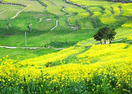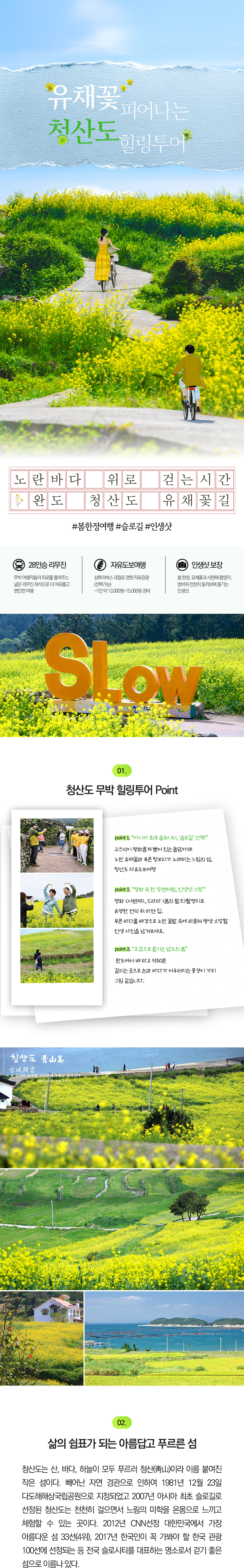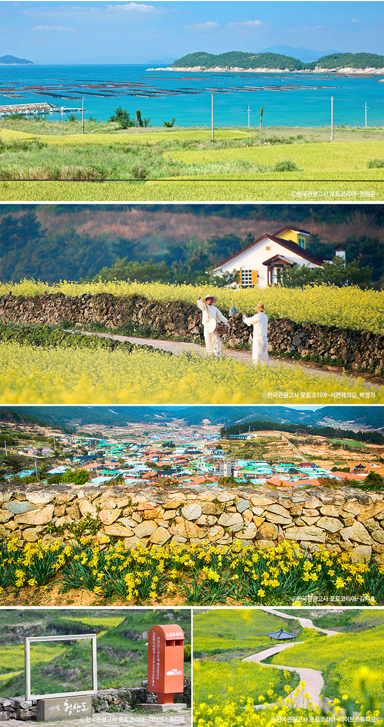 청산도 여행 - 매년 봄이 되면 유채꽃 만개하는 아시아 최초의 슬로시티 - 완도에서 배 타고 약50분 걸리는 곳으로 논과 바다가 어우러지는 풍경이 가히 그림 같습니다. - 고즈넉이 평화롭게 뻗어 있는 돌담아래 노란 유채꽃과 푸른 청보리가 노래하는 느림의 섬, 청산도 - 자유도보여행 - 점심식사(식당이용가능)