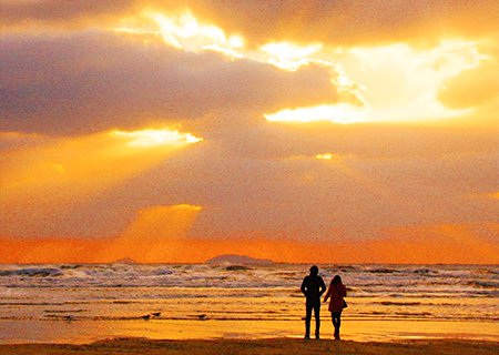 태안해변길 중 가장 인기가 좋은 태안 노을길은 백사장항을 출발하여 꽃지해수욕장까지 이어지는 해변 길로 안면도 북쪽에서 섬의 남쪽으로 내려가는 코스다. 오른쪽으로 서해를 바라보며 안면송이 가득한 해변 길을 걷게 된다. 백사장항을 출발하여 걷다 보면 세 개의 봉우리가 인상적인 삼봉해변과 울창한 곰솔 숲을 지나고 기지포해수욕장이 나온다. 노을길 중 가장 다양한 탐방로가 있는 기지포에는 해안사구와 탐방지원센터가 있다. 휠체어나 유모차도 쉽게 다닐 수 있도록 나무 데크도 설치되어 있어 천사 길이라고도 불린다. 창정교를 지나 올라가면 두여전망대가 나타나는데 이곳은 노을길 가운데서도 가장 좋은 전망을 감상할 수 있는 포인트. 독특한 습곡이 내려다보이며 먼바다의 탁 트인 조망이 가슴을 후련하게 한다. 방포항 근처에는 천연기념물 모감주나무 군락이 있고 방포 전망대가 있어 여기서 꽃지해변이 보인다. 노을길 마지막 코스인 꽃지해수욕장은 서해안 일몰이 아름답기로 유명하다.