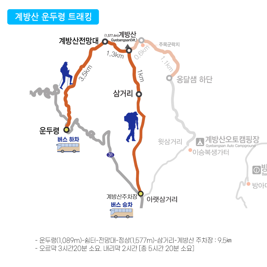 계방산 눈꽃 트래킹 - 운두령(1,089m)-쉼터-전망대-정상(1,577m)-계방산 주차장 : 9.5㎞ - 오르막 3시간20분 소요. 내리막 2시간 [총 5시간 20분 소요] * 트래킹난이도 : 중(중)