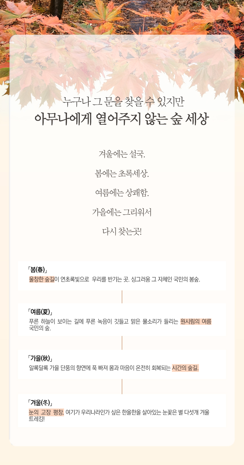 대관령 국민의 숲길 트래킹 - 10㎞, 약3시간30분 - 대관령휴게소-국민의 숲-이깔나무숲-대관령휴게소 - 강릉 바우길 중 한 구간을 맡고 있는 대관령의 명품 숲길! - 대관령 휴게소에서 출발해 숲길을 걷는데 맑은 공기와 풍경 속에 몸과 마음이 정화되는 기분을 만끽 할 수 있습니다. * 트래킹난이도 : 하(중) |
