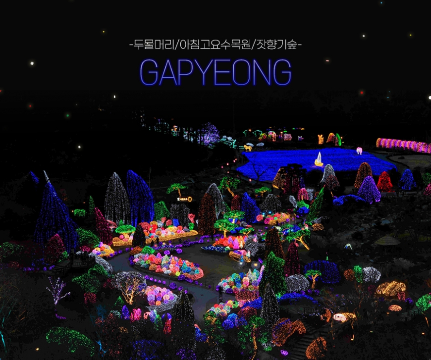 아침고요수목원 별빛축제 * 입장료 포함(11,000원) - 점등시간: 오후5시에서 9시까지 - 10만여 평의 야외 정원 곳곳을 다채로운 조명과 빛을 이용하여 특별한 주제를 가지고 표현한 야간 조명 점등행사이다. - 자연과 빛의 조화를 추구하며 국내 최초로 시도된 새로운 빛의 풍경인 ‘오색별빛정원전’은 인공적인 조명 속에서도 한국 자연의 미를 한껏 느낄 수 있어 많은 관람객들에게 사랑받고 있다. - 매년 12월에서 3월(동절기)사이 개최되는 '오색별빛정원전'은 수목원 내 전 정원을 밑그림 삼아 친환경 소재인 LED 전구를 사용하여 그려진 화려한 빛 축제의 장이 될 것이다.