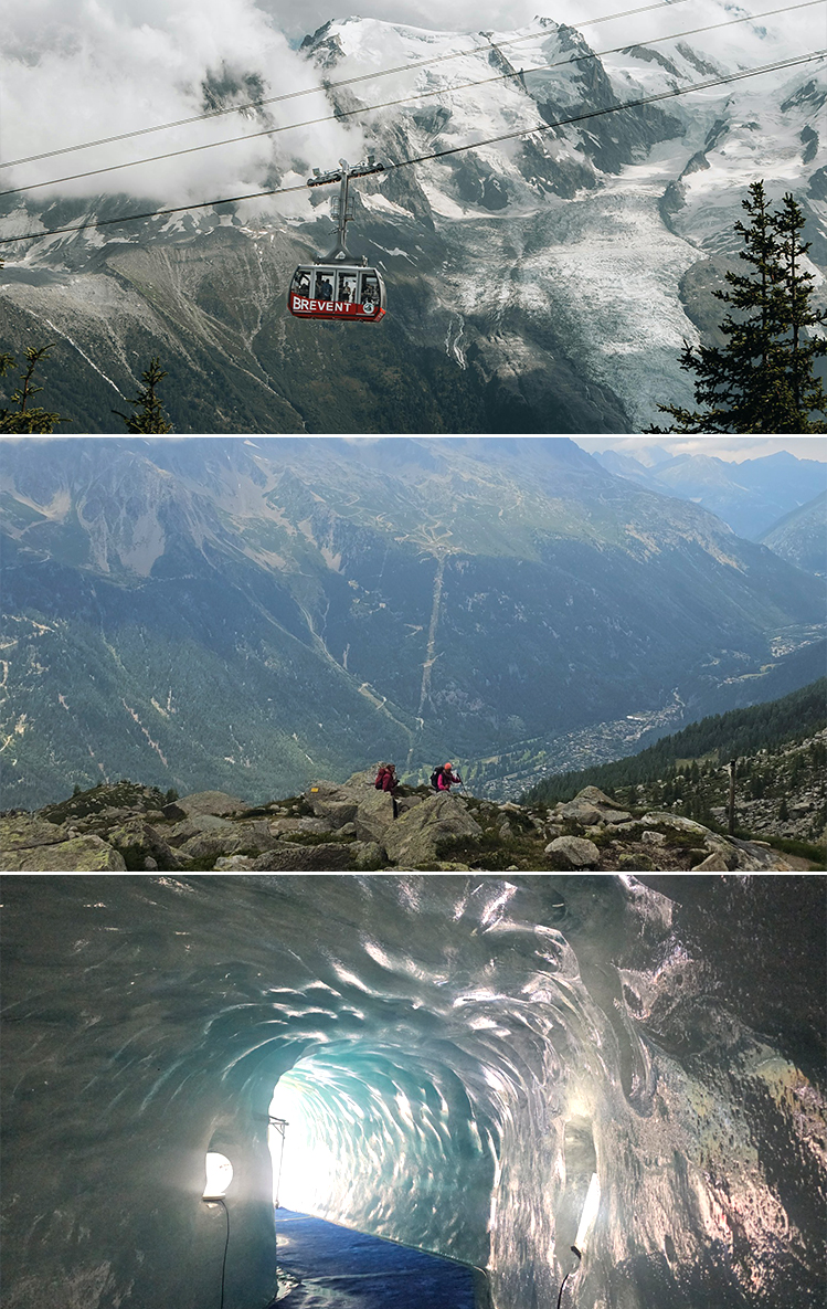 세번째 미봉, "몽블랑(4,805.59m)" ▶케이블카로 프랑스 최고의 전망대 에귀 듀 미디(Aiguille-du-Midi) 봉에 올라 몽블랑 산군을 전체적으로 조망 + 케이블카로 플랑데레귀로 1단계 하산 + 호수 조망 ![]() ▶몽땅베르 트레킹 (5㎞, 4시간) 플랑데레귀(Plan de L’Aiguille, 2,317m)~몽땅베르(1,913m)까지 트레킹. 오른쪽으로는 몽블랑 산군을 왼쪽으로는 샤모니 계곡을 바라보며 걸어봅니다. + 케이블카로 빙하 아래로 하산 + 빙하의 얼음 동굴(Gare du Montenvers Mer de Glace) + 기차로 샤모니 하산