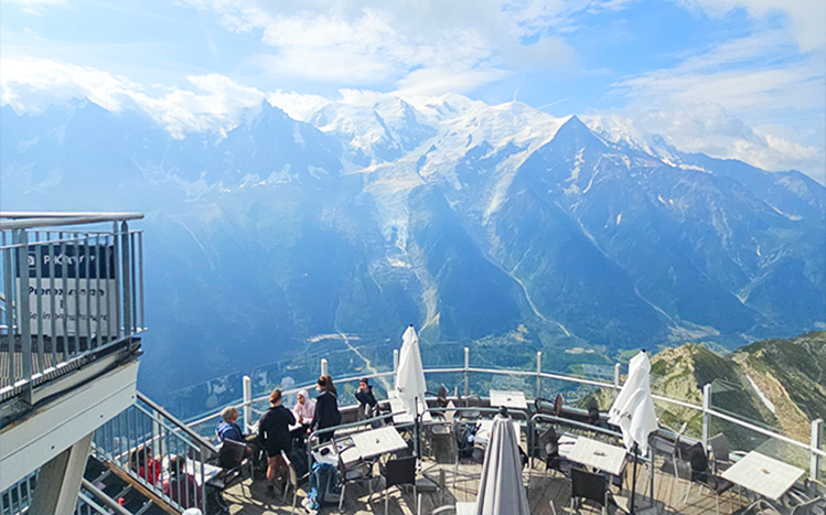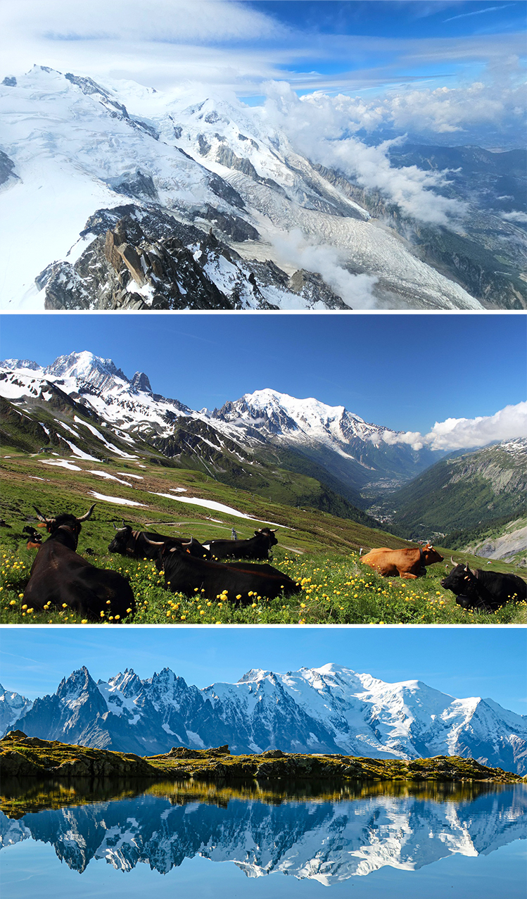 프랑스와 이탈리아의 국경을 따라 길게 뻗어 있는 알프스산맥의 최고봉이자 서유럽 최고봉 몽블랑이 가장 잘 보이는 위치에 자리한 프랑스 산악마을 샤모니(,Chamonix)는 파노라마로 펼쳐지는 침봉군들과 빙하를 감상하며 걸을 수 있는 트레킹 코스로 유명합니다. 몽블랑이라는 명칭의 뜻은 프랑스어로 몽(Mont)이 ‘산’, 블랑(Blanc)이 ‘하얀색’이라는 뜻을 가지고 있으니 ‘흰 산’이란 뜻이다, 산 정상부를 만년설이 덮고 있는 것을 생각해보면 딱 들어 맞는 이름인 듯, 이탈리아어로는 몬테 비앙코(Bonte Bianco)라고 하며 프랑스어 명칭과 동일한 의미라고 한다. 지구 온난화로 인해 몽블랑산의 빙하가 사라질 위기를 겪고 있다고 한다. |
