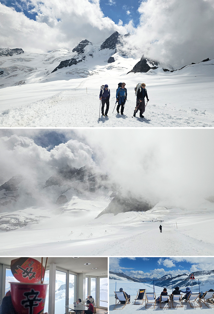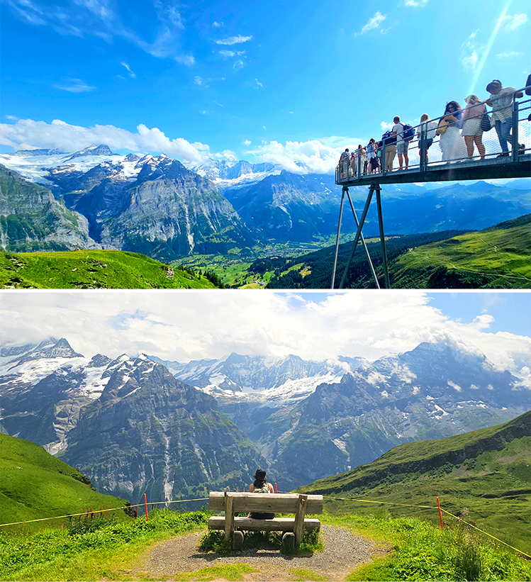 첫번째 미봉 “융프라우(4,158m)” 그린덴발트에서 케이블카를 타고 올라 멘리헨 산장 도착 ▶로얄길 트레킹 - 거리: 왕복 2㎞, 소요시간: 1시간 - 로얄길 전망대에 올라 파노라마 뷰로 풍경 감상 ![]() ▶멘리헨 파노라마 트레킹 - 거리: 편도 4㎞, 소요시간: 2시간 - 멘리헨 산장에서 클라이네 샤이덱까지 걷는 트레킹으로 걷는 내내 아이거 북벽과, 묀히, 실버호른, 융푸라우의 전경이 파노라마로 펼쳐진다. +클라이네 샤이덱에서 점심 식사 ![]() ▶융프라우 눈꽃 빙하길 트레킹 - 거리: 왕복 4㎞, 소요시간: 2시간 30분 + 사발커피 + 융프라우요흐 산악열차를 타고 전망대까지 올라 세계에서 가장 높은 기차역 융프라우요흐 전망대 투어. + 엘리베이터를 타고 100미터 아래로 내려가면 순백의 만년 설산이 펼쳐진다. 무더운 여름, 순백의 만년설을 즈려 밟으며 묀히요흐산장(4,107m)까지 다녀오는 눈길 트레킹으로 융프라우와 빙하를 만끽할 수 있는 코스. + 아이거 글래처역으로 산악열차 하산 후 그린델발트로 3S곤돌라 이용 하산. ![]() Top of Europe, 융프라우요흐[Jungfraujoch]