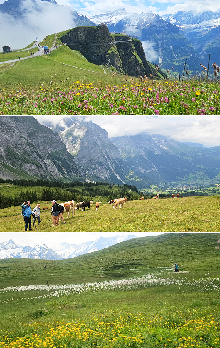 ▶바흐알프제 파노라마 트레킹 - 거리: 편도 5㎞, 소요시간: 2시간 + 그린덴발드에서 그로스 샤이덱(Grosse Scheidegg)로 셔틀버스(128)를 타고 오른다. (Berg산장: 금, 토, 일, 월, 화 10:00~17:00) + 그로스 샤이덱에서 아이거 파노라마뷰와 융프라우, 가깝게는 베터호른, 슈렉호른의 산군들을 바라보며 푸른 초원의 말과 소, 야생화를 감상하며 편안하게 피르스트 산장 (Bergrestaurant First, 2200m)까지 걷는 편안한 트레킹. ![]() +점심식사(산장식) ![]() ▶Eiger Ulrra-Trail 트레킹 - 거리: 왕복 3㎞, 소요시간: 2시간 + 그린덴발트에서 최고의 전망대 중 하나인 피르스트에서 바흐알프제(Bachalpsee) 호수까지 왕복 트레킹. + Grindelwald-First Top of Adventure(피르스트 절벽 산책로) 인증샷. + 곤돌라 그린덴발드로 하산. ![]() 피르스트 전망대에서 바라본 풍경입니다. ![]() 바흐알프제 호수(Bachalpsee Lake)에서 다시 발걸음을 돌려 되돌아옵니다. |