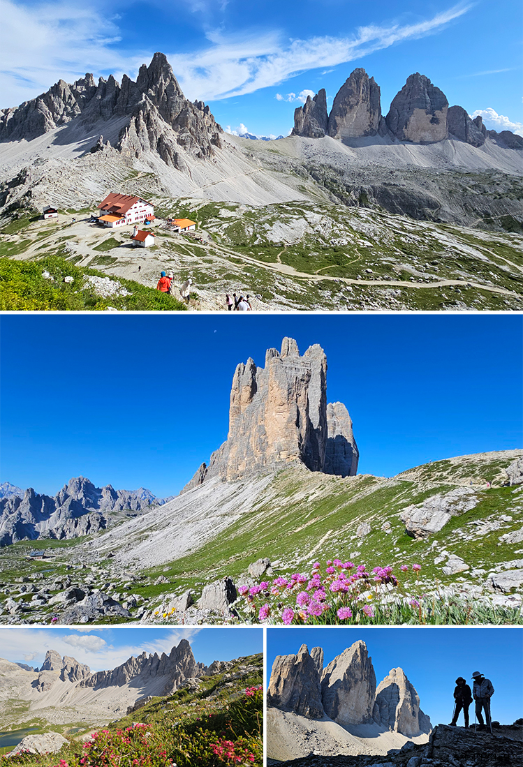 호텔 조식 후 출발 (1시간 이동, 30분) 트레치메 디 라바레도(Trecime di Lavaredo) 트레킹 "돌로미테의 하이라이트" ◑ 루트: 아우론조 산장(Rif. Auronzo / 2,320m) --> ~>랭알름산장(Malga Langalm)~>로카텔리 산장(Rif. Locatelli / 2,405m) ◑ 거리: 6㎞, 소요시간: 3시간 - 천천히 걸으며 트레치메와 로카델리 산장의 풍경을 충분히 즐겨봅니다 ![]() - 로카델리산장 인생샷: 동굴샷, 일몰, 피아니호수(laghi dei Piani), 은하수 투어 Hotel: 로카델리산장(Rifugio antonio Locatelli, 다인실) ![]() -로카델리 산장에서 먹는 저녁식사 ![]() 트레치메 디 라바레도(Trecime di Lavaredo) 트레킹
