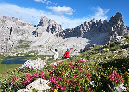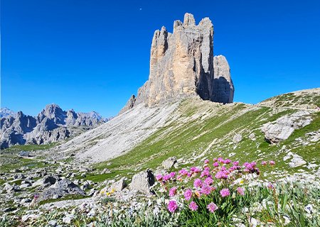 돌로미테 산군에서 가장 유명한 트레치메디 라바레도는 적벽 높이만 약 1,000m 이상인 치마피콜로(2,856m), 치마그란테(3,003m), 치마오베스트(2,972m), 이렇게 세 개의 봉우리로 이뤄진 거대한 암봉입니다. 암벽 등반의 성지로도 불리는 웅장한 세 봉우리 아래에 서면 자연에 대한 경외감이 저절로 생길 정도입니다. 아우론조 산장에서 시작하여 시계 방향으로 봉우리를 가운데 두고 한 바퀴 돌아오는 트래킹으로 트레치메 디 라바레도를 가장 가까이에서 볼 수 있으며, 일몰과 일출의 장엄하고도 아름다운 풍광을 볼 수 있습니다. 돌로미테 최고 트래킹 코스 중 가장 하이라이트로 꼽히는 트레치메 디 라바레도 코스에서 가장 아름다운 돌로미테의 풍광을 눈에 담아보세요
