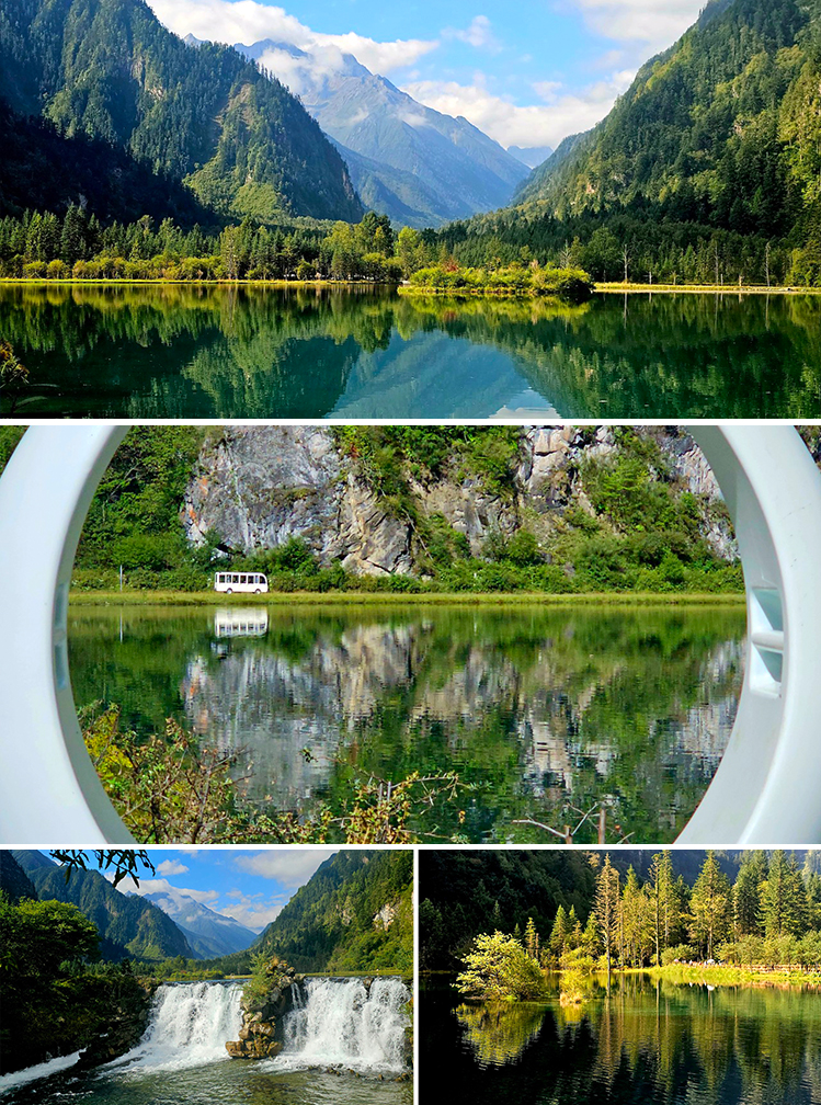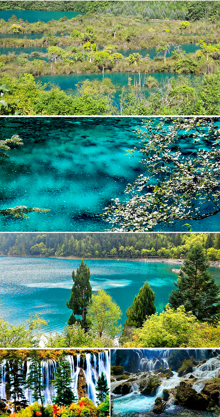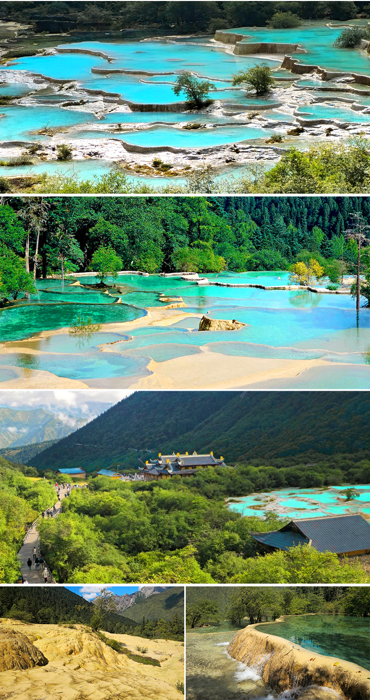 해발 약 3,800m에 위치하고 있으며 계단식으로 이루어진 계곡을 울창한 전나무들이 감싸고 있다. 황룡 풍경구 중에서도 특히 '오채지'가 유명한데 옥색 물빛의 작은 연못이 약600여개가 모여있다. 이 곳이 신비한 물색깔을 띄는이유는 이 지역의 토양의 석회질 성분이 높기때문이라고한다. 해발고도가 높아 주변의 설산을 가까이에서도 볼 수도 있다. |