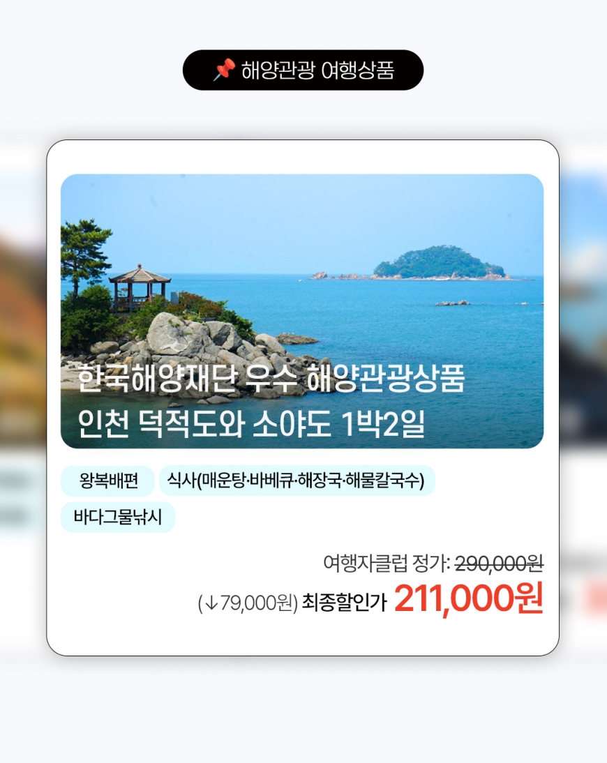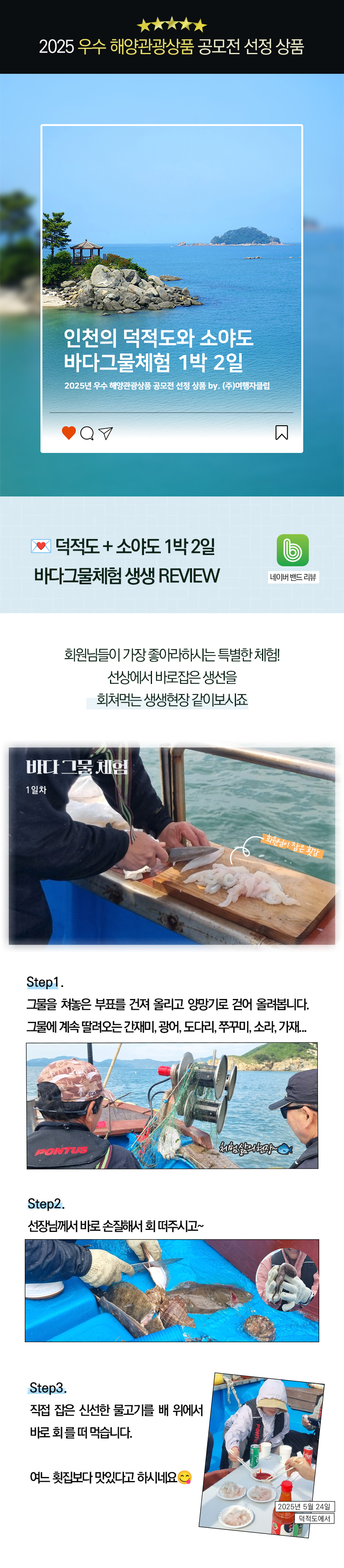 바다 그물 체험 (3시간 소요) - 선박을 타고 바다로 나가 그물로 물고기(간재미, 도다리, 광어 등)를 잡거나 꽃게, 쭈꾸미 등 계절에 맞는 체험을 진행합니다. - 잡은 고기나 해산물은 현지에서 음식을 만들어 드시거나 가져가실 수 있습니다. 인천옹진 덕적도 그물체험