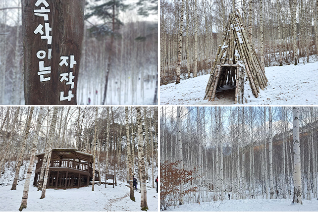 자작나무 숲 안에서는 다양한 난이도와 거리의 탐방로를 선택할 수 있다. 가장 인기 있는 코스는 순백의 자작나무 숲 집중 생육 지역을 볼 수 있는 1코스(자작나무 코스)로, 약 0.9㎞ 거리이며, 약 50분 정도 소요된다. 겨울철에는 흰 눈에 뒤덮인 숲과 새하얀 자작나무가 어우러져 사진 촬영 장소로 인기가 좋다. |