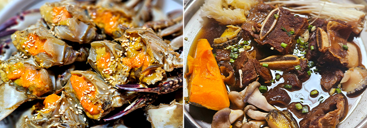 점심식사(경주 맛집'진수성찬') - 식당이 한옥이며 분위기 최고입니다 - 4인용 테이블에 최고의 대표 메뉴 - 경주최가 전복 소갈비찜 1인 29,000원(2인분) - 경주최가 알배기 암꽃게 간장게장 1인 29,000원(2인분) 제공합니다.