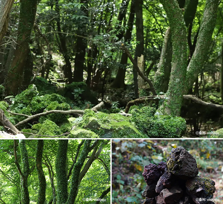 곶자왈은 한라산을 중심으로 중산간 지대 여러 곳에 걸쳐 분포되어 있다. 고유 제주어로 ‘곶’은 ‘숲’을 뜻하며, ‘자왈’은 표준어의 ‘덤불’에 해당한다. 화순곶자왈 생태탐방 숲길에 들어서면 곳곳에 마련된 이정표를 잘 따라야 한다. 울창한 숲길을 걷다 보면 전망대를 만나는데 멀리 산방산과 소를 방목하는 목장이 보인다. 테크길과 흙길이 고루 분포되어 있으며 반려견 동반도 가능해 조용하고 한적한 숲길을 외롭지 않게 산책하기 좋다. ‘한국 아름다운 숲’ 공존상을 수상한 이력만큼 생태 그대로를 보전한 신비로운 원시림의 매력을 느낄 수 있다.