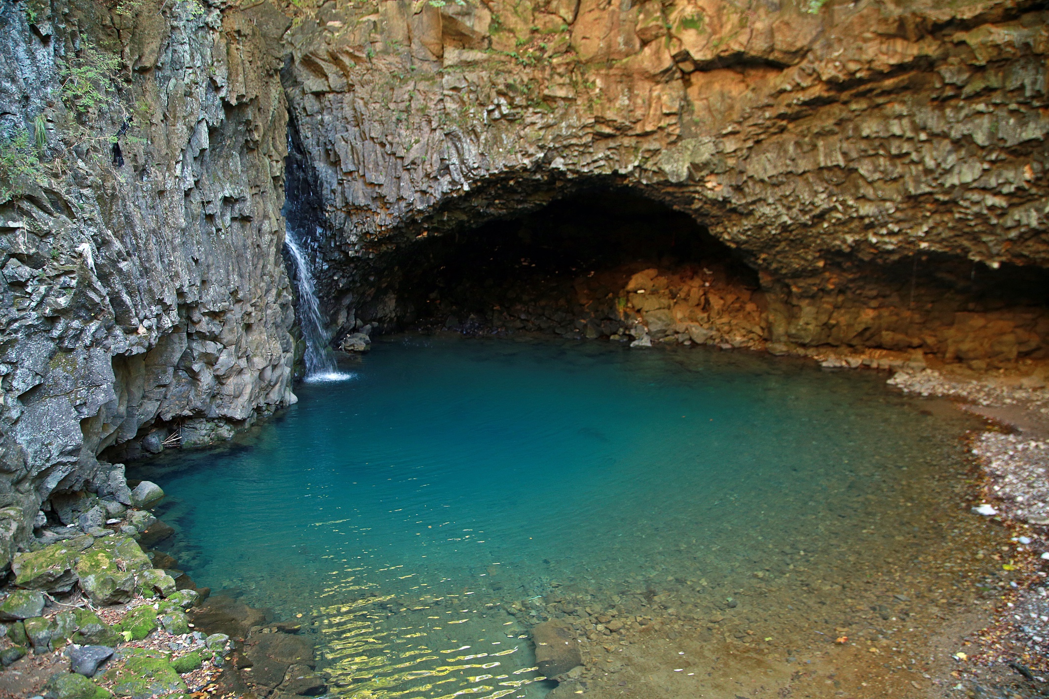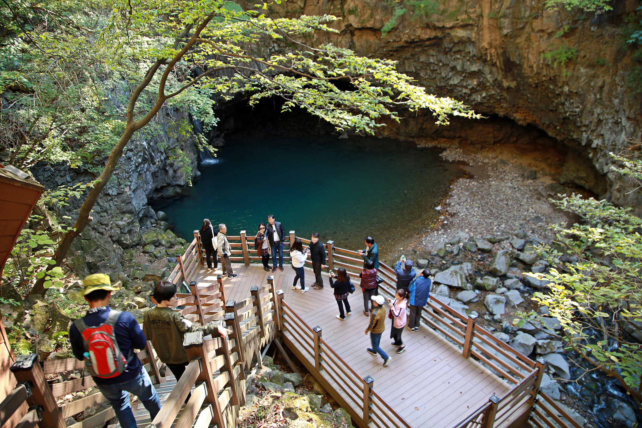 재인폭포는 오래전부터 명승지로서 널리 알려져 있다. 재인폭포는 높이 약 18m에 달하는 현무암 주상절리 절벽으로 쏟아지는 것이 그야말로 장관을 이룬다. 폭포의 이름과 관련된 아름다운 사랑이야기도 전해오고 있다. 재인폭포에서는 다양한 현무암의 특징들을 관찰할 수 있는데, 대표적으로 주상절리를 비롯하여 하식동굴과 포트홀, 가스튜브 등을 볼 수 있다. 높이 약 18m에 달하는 폭포는 계속해서 폭포 아래를 침식시켜서 수심 5m에 달하는 포트홀을 만들었다. 포트홀이란 하천에서 암석의 오목한 곳이나 깨진 곳에 와류(물이 회오리 치는 현상)가 발생하여 깊은 구멍이 생겨난 것을 말한다.