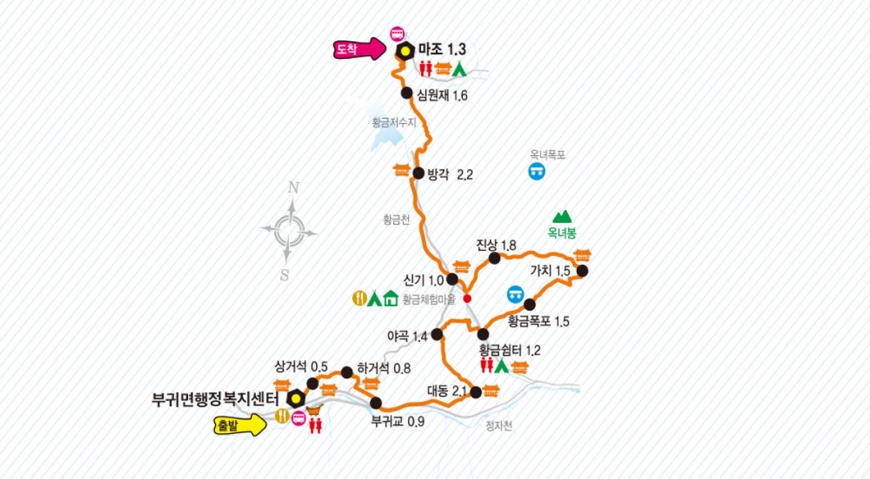 진안 고원길 7구간 트래킹 - 코스: 부귀면 행정복지센터->마조 - 거리: 17.8㎞, 소요시간: 약 7시간 (인증지점:황금폭포/심원재) ![]() * 트래킹난이도 : 중(중) 진안고원길 7구간 (황금폭포 하늘길)