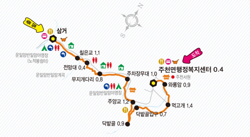 진안 고원길 9구간 트래킹 - 코스: 삼거->주천면 행정복지센터 - 거리: 9㎞, 소요시간: 약 3시간 (인증지점:닥밭골/와룡암) ![]() * 트래킹난이도 : 하(중) ※참고 진안 고원길 9구간 도보여행 거리가 짧은 관계로 11-1구간 [감동벼룻길 3.7㎞ (난이도 하 / 1시간 30분소요)]를 함께 진행합니다. 진안고원길 9구간 (운일암 반일암 숲길)