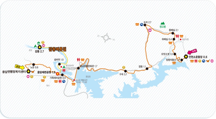 진안 고원길 11구간 트래킹 - 코스: 용담면 행정복지센터->안천소운동장 - 거리: 16㎞, 소요시간: 약 5시간 30분 (인증지점:가족테마공원/오얏고개) ![]() * 트래킹난이도 : 중(하) 진안고원길 11구간 (금강 물길)