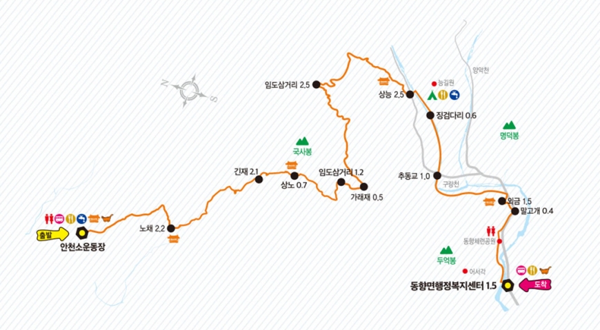 진안 고원길 12구간 트래킹 - 코스: 안천소운동장->동향면 행정복지센터 - 거리: 16.7㎞, 소요시간: 약 6시간 30분 (인증지점:긴재/가래재) ![]() * 트래킹난이도 : 중(중) 진안고원길 12구간 (고개너머 동향길)