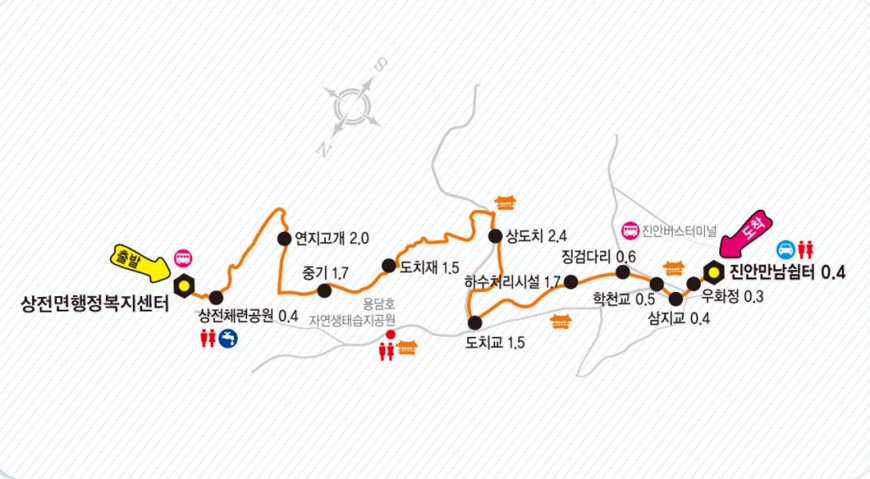 진안 고원길 14구간 트래킹 - 코스: 상전면 행정복지센터-> 진안만남 쉼터 - 거리: 13.4㎞, 소요시간: 약 4시간 (인증지점:연지고개/도치재) ![]() * 트래킹난이도 : 하(중) ※완주 관련 - 완주자 상품 증정 및 완주 현수막 기념사진 촬영 - 완주자를 위한 파티 진안고원길 14구간 (진안천 물길)