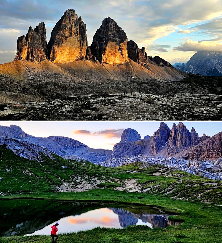 돌로미테 산군에서 가장 유명한 트레치메디 라바레도는 적벽 높이만 약 1,000m 이상인 치마피콜로(2,856m), 치마그란테(3,003m), 치마오베스트(2,972m), 이렇게 세 개의 봉우리로 이뤄진 거대한 암봉입니다. 암벽 등반의 성지로도 불리는 웅장한 세 봉우리 아래에 서면 자연에 대한 경외감이 저절로 생길 정도입니다. 아우론조 산장에서 시작하여 시계 방향으로 봉우리를 가운데 두고 한 바퀴 돌아오는 트래킹으로 트레치메 디 라바레도를 가장 가까이에서 볼 수 있으며, 일몰과 일출의 장엄하고도 아름다운 풍광을 볼 수 있습니다. 돌로미테 최고 트래킹 코스 중 가장 하이라이트로 꼽히는 트레치메 디 라바레도 코스에서 가장 아름다운 돌로미테의 풍광을 눈에 담아보세요