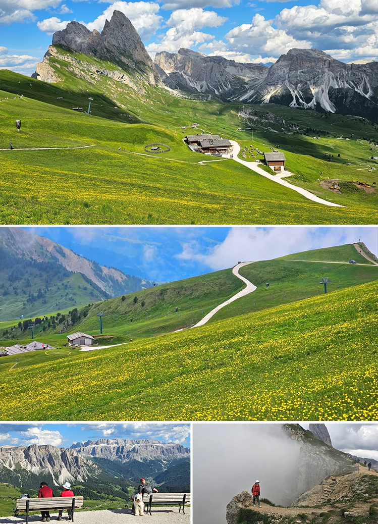 호텔 조식 후 이동 (30분소요) 치르(Cir) 트레킹 ◐ 루트: Dantercepies 케이블카 탑승~>Dantercepies 승강장 하차 뷰포인트인 JimmiHut 산장으로 이동 ~>콜포스코(Calfosch)로 하산 서쪽으로는 싸소룽고 산군(Sasslungo Group)과 남쪽으로는셀라 산군(Sella Group)이 함께합니다. |