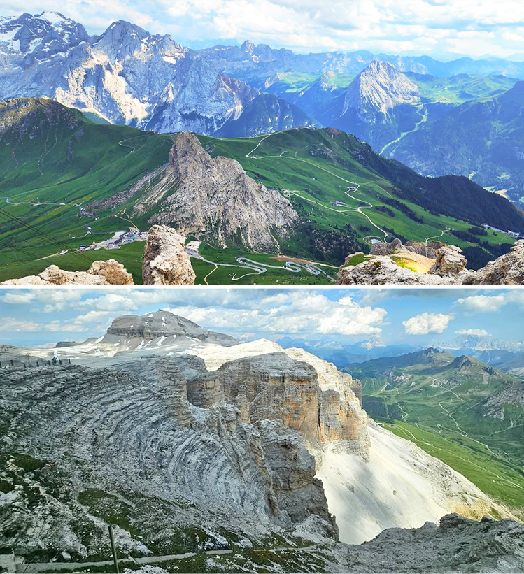 · 싸쓰 포르도이(Sass Pordoi) 트레킹 - 마르몰라다와 피츠보에 싸쏘룽고 산군들을 파노라마로 감상하며 힘들이지 않고 걷는 여정 ◐루트: 벨베드레(Belvedere di Canazei) 곤돌라 출발~>벨베드레산장(Chalet Belvedere)~> 베세(Sasso Beccé) 하이킹~>파소 포르도이(Passo Prodoi)~>곤돌라로 싸쓰 포르도이(Sass Pordoi)~>보에산장 왕복~>싸쓰 포르도이에서 곤돌라 하산 ![]() 호텔로 이동(40분소요) 호텔 숙박 및 휴식 싸스 포르도이(Sass Pordoi ) 트레킹