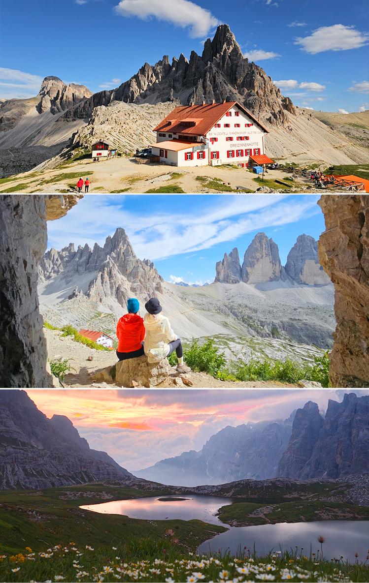 호텔 조식 후 출발 (1시간 이동, 30분) 트레치메 디 라바레도(Trecime di Lavaredo) 트레킹 "돌로미테의 하이라이트" ◑ 루트: 아우론조 산장(Rif. Auronzo / 2,320m) --> ~>랭알름산장(Malga Langalm)~>로카텔리 산장(Rif. Locatelli / 2,405m) ◑ 거리: 6㎞, 소요시간: 3시간 - 천천히 걸으며 트레치메와 로카델리 산장의 풍경을 충분히 즐겨봅니다 ![]() - 로카델리산장 인생샷: 동굴샷, 일몰, 피아니호수(laghi dei Piani), 은하수 투어 Hotel: 로카델리산장(Rifugio antonio Locatelli, 다인실) ![]() -로카델리 산장에서 먹는 저녁식사 ![]() 트레치메 디 라바레도(Trecime di Lavaredo) 트레킹