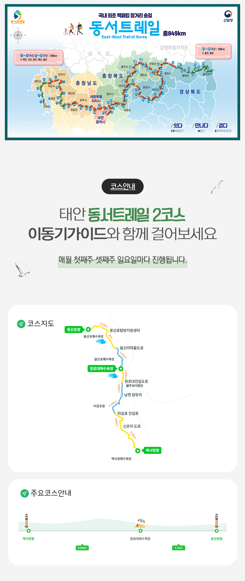 동서트레일 2코스 트래킹 - 코스: 백사장항~마검포항~청포대해수욕장~몽산포해수욕장 - 거리: 12㎞, 소요시간: 약3시간 ![]() 동서트레일2코스