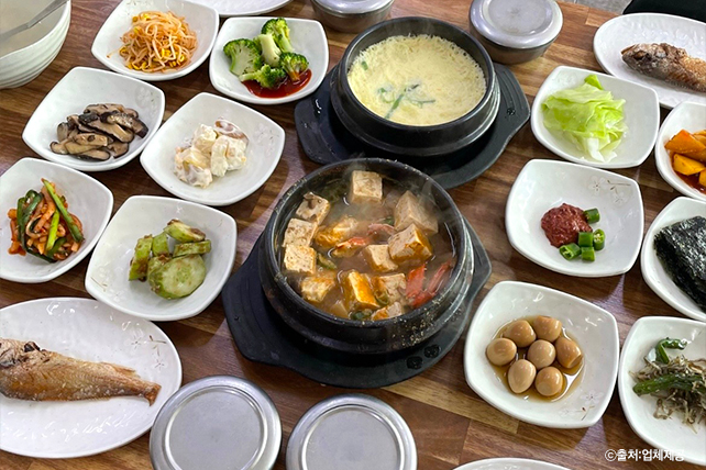 풍기시장에서 늦은 점심식사(제공식) - 시골밥상: 나물과 찬 15가지, 된장찌개, 계란찜, 바삭한 생선구이 포함된 한 상 ![]() |